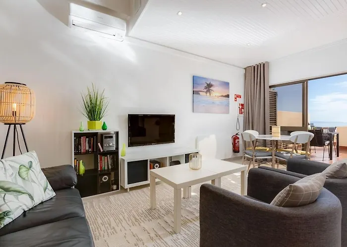 Bellevue By The Sea - Oceanfront For 4 With Stunning Views At Praia Dona Ana appartementen beschikken over een terras, een zitruimte en een keuken, biedt airconditioning en een wasmachine aan, en kijken uit over de zee. Voor extra comfort zijn een apart toilet te vinden bij deze accommodatie. Een haardroger en badlakens zijn ook aanwezig in de badkamer.